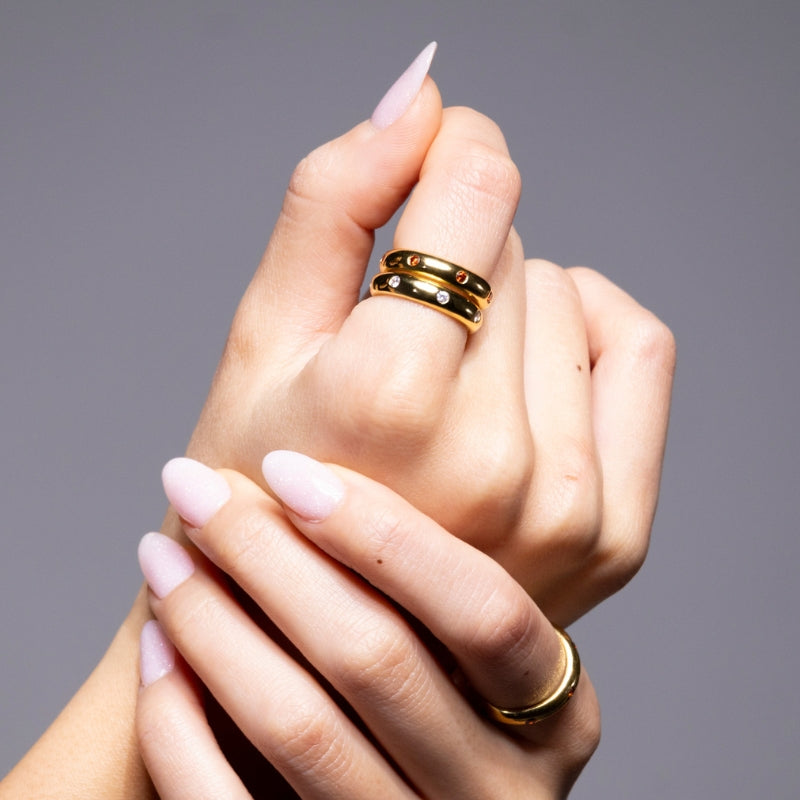 Super cute ring for stacking! I was looking for rings that I could stack, so I got this and the white diamond rings. I love the way they look on my hands, and the quality is amazing. They don't tarnish or wear at all, and the quality of them look so good for the price point.
