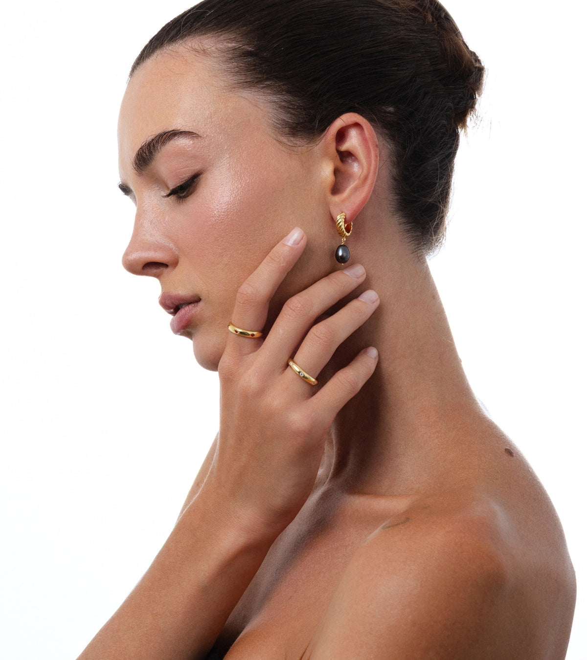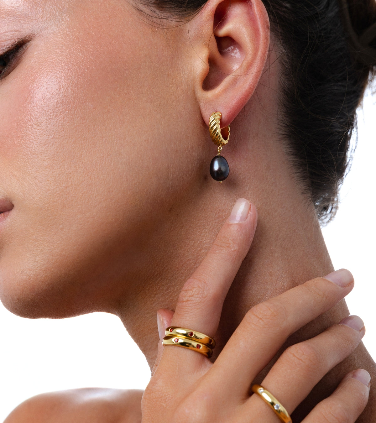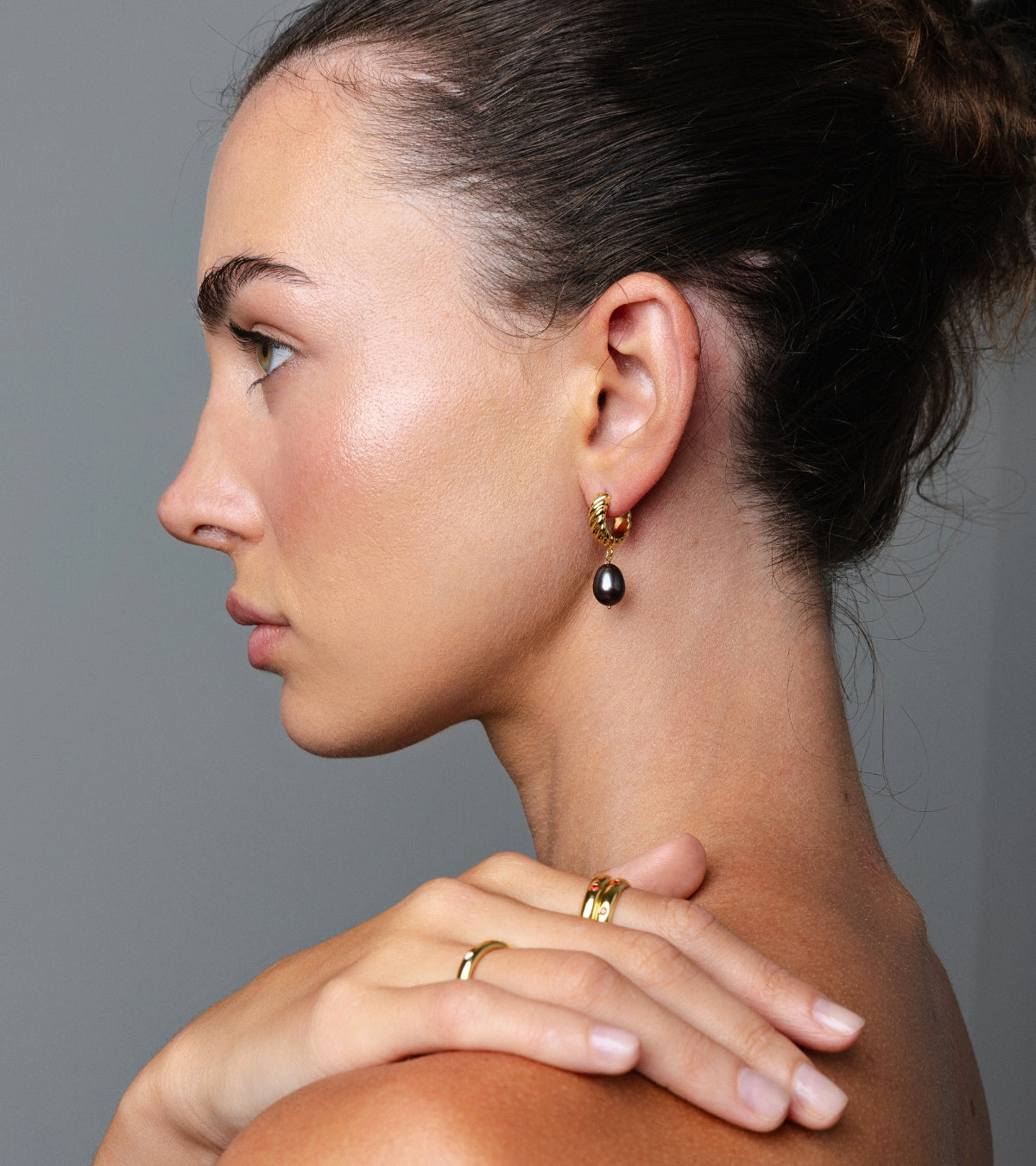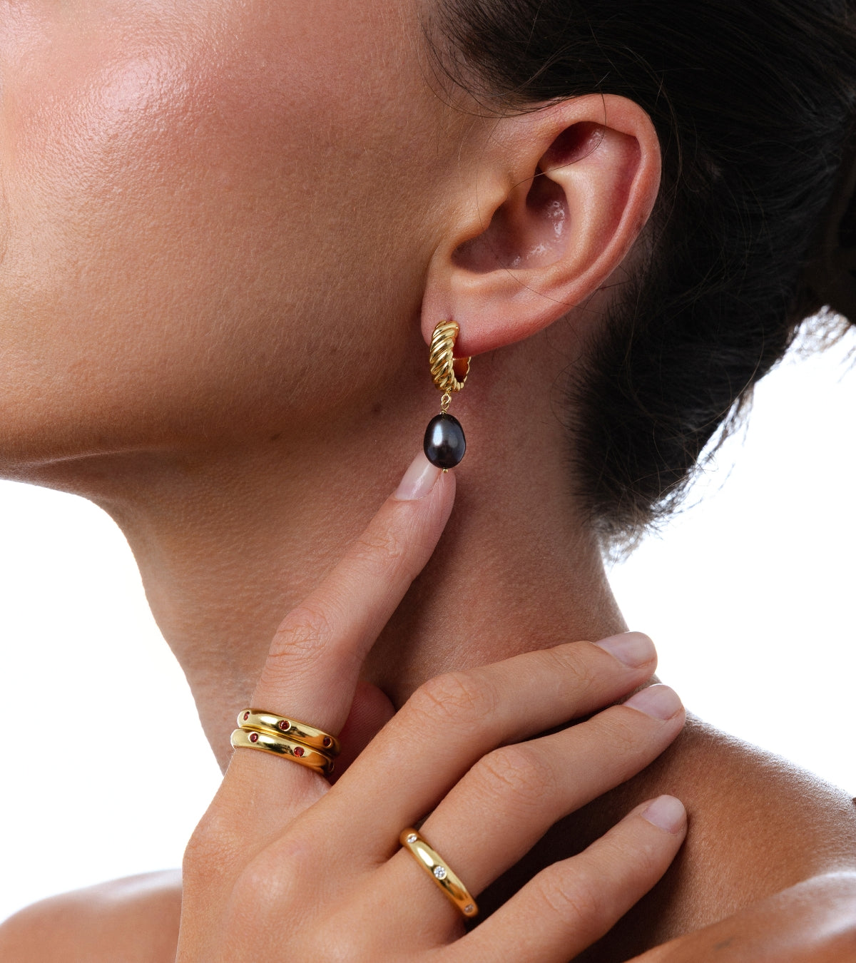La Perle (Purple) is a modern heirloom with vintage charm. It features a ribbed gold hoop inspired by retro silhouettes, paired with a delicate drop of deep purple freshwater pearl, adding a soft pop of color that feels both nostalgic and fresh. Versatile enough for your everyday rotation, yet striking enough to stand out, this piece moves effortlessly from day to night.